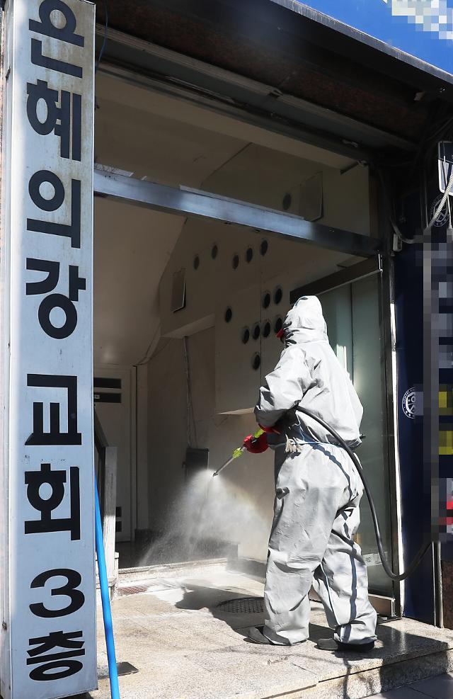 [写真=聯合ニュース(16日、信徒40人が新型コロナウィルス感染症に感染し、計46人の感染者が発生した京畿道城南市の「恩恵の川協会」で防疫作業が行われている)]