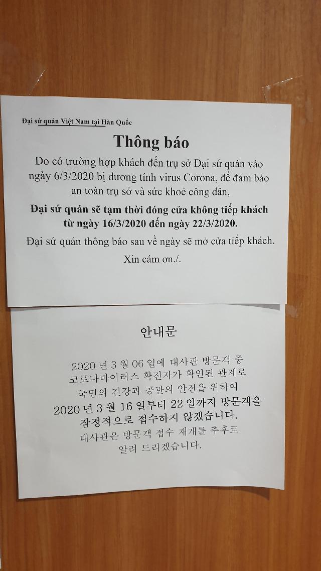 駐韓ベトナム大使館がすべての受付業務を中止すると明らかにした。 コロナ19感染者が今月6日、大使館を訪れたことが確認されたためだ。